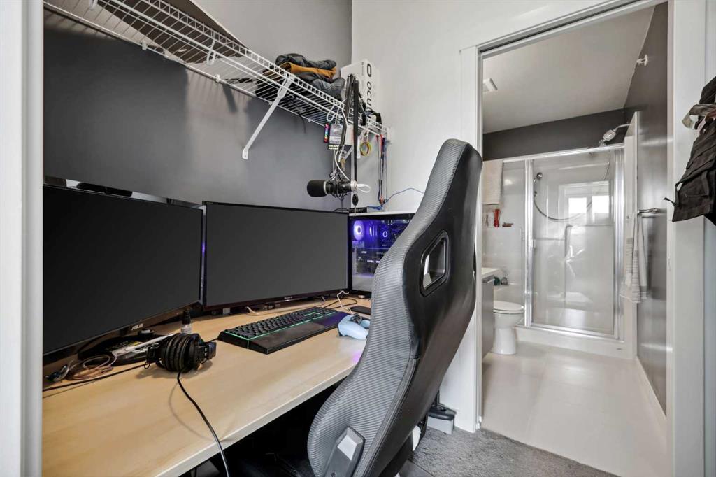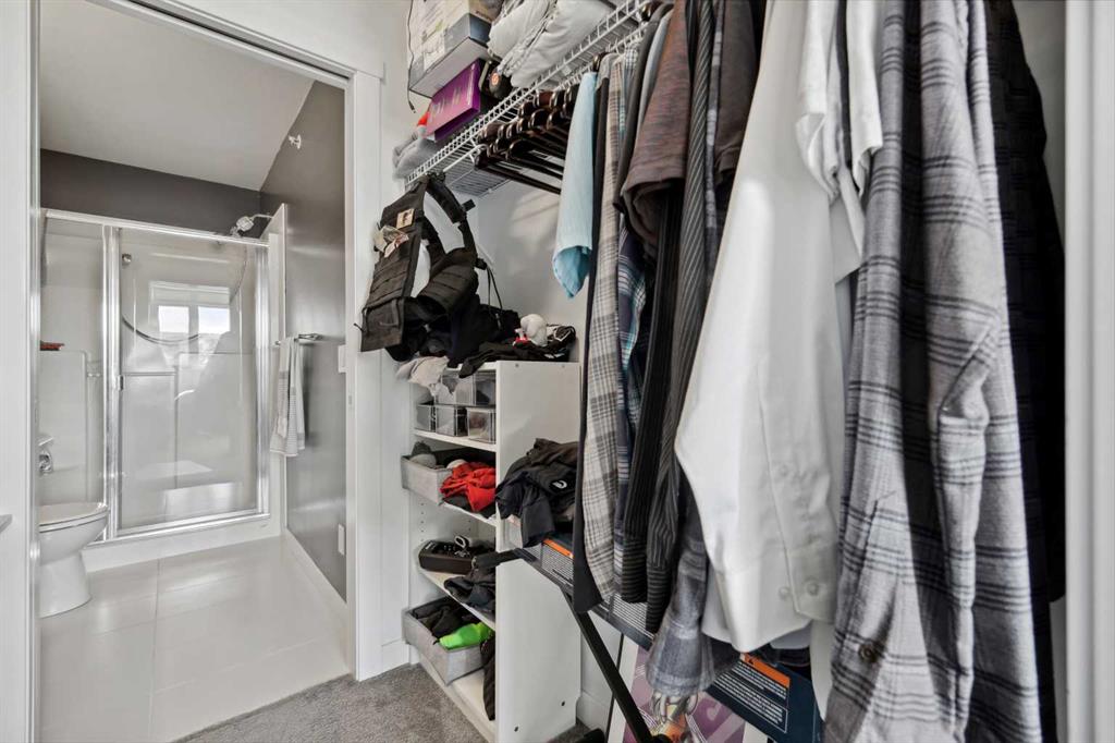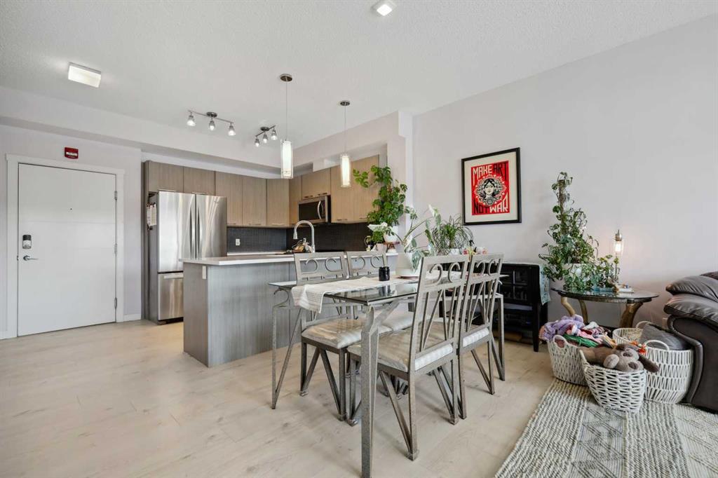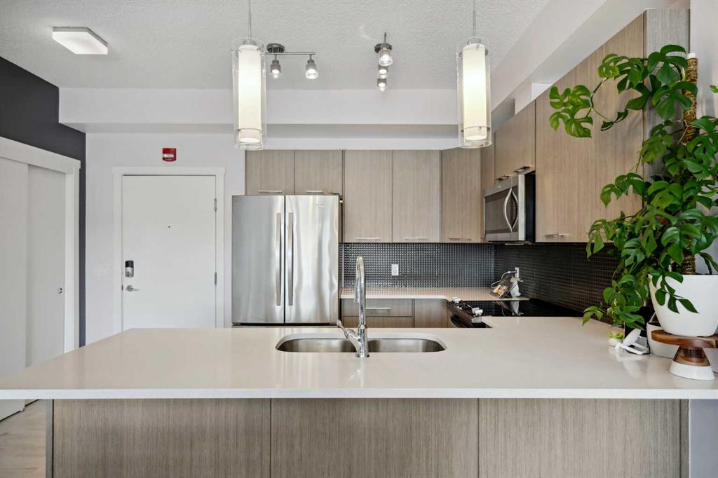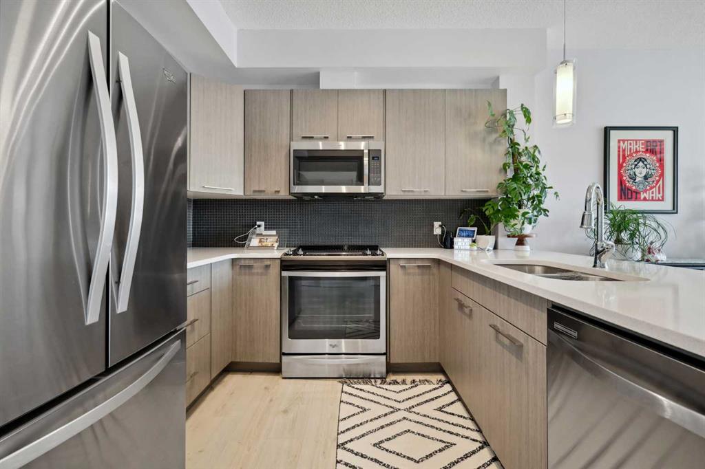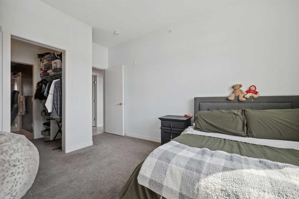 Experience top floor elegance in Unit #412 at 214 Sherwood Square NW. This stunning 2-bedroom, 2-bathroom condo boasts a southwest facing balcony with serene views of Sherwood Square Lake. The modern kitchen dazzles with quartz counters, stainless steel appliances, and a chic sit-up breakfast bar. With generous cabinet and counter space, the kitchen is a dream for cooking and entertaining. Gorgeous luxury vinyl plank flooring flows throughout the main living spaces. With 9-foot ceilings and ample natural light the open concept feels bright and airy. Retreat to the primary bedroom with a walk-through closet leading to the 3-pieace ensuite, featuring a walk-in shower. A second bedroom and 4-piece bathroom provide comfort and convenience. Additional perks include in-suite laundry, generous storage, a titled parking stall in the heated underground parkade, and secure bike storage. Situated near Sage Hill Plaza & Beacon Hill, pathways, LRT and major roadways, this condo offers the perfect blend of style and functionality. Contact your Realtor today to book a showing!